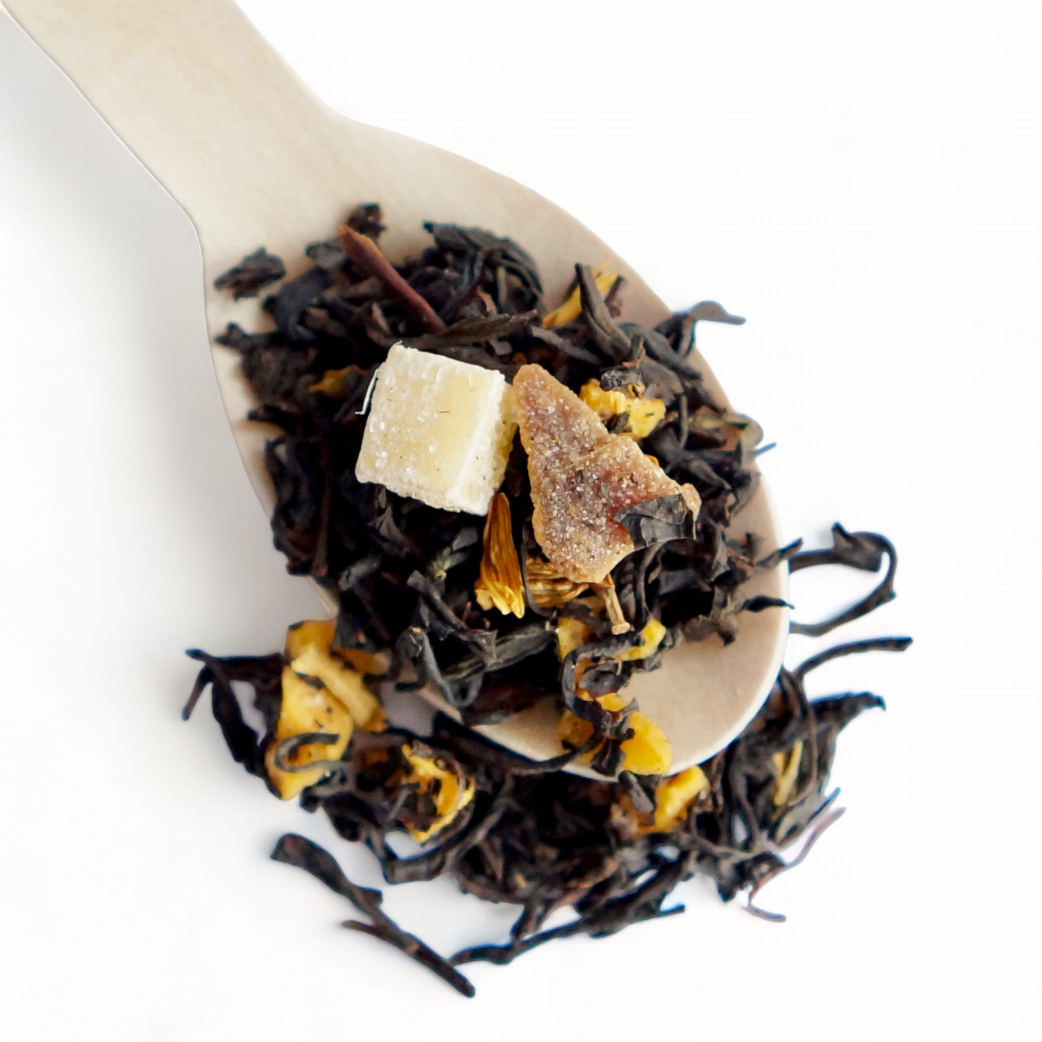 Składniki: herbata czarna, suszona brzoskwinia, imbir kandyzowany, kandyzowana marakuja, kwiat słonecznika, naturalny aromat.