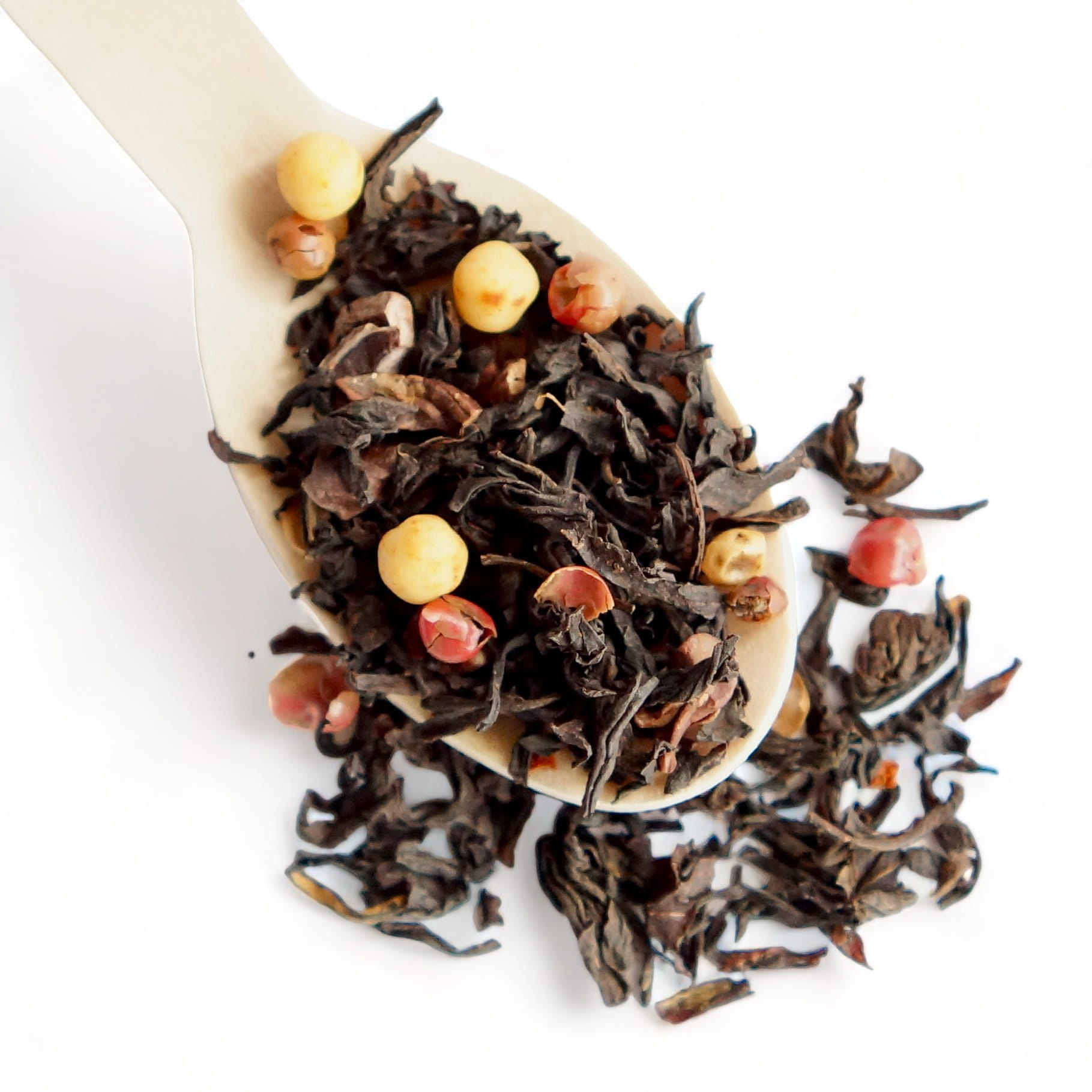 Składniki: herbata czarna z Ceylonu i Płd. Indii, kawałki kakao (15%), aromat, różowy pieprz, kawałki białej czekolady (cukier, czipsy mleczne, masło kakaowe, proszek mleczny, lecytyna sojowa, aromat: ekstrakt waniliowy) (2,5%), kawałki chilli (1%)
