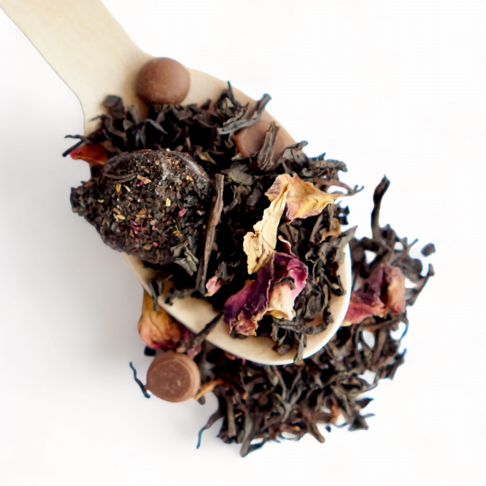 Składniki: herbata czarna, suszone wiśnie, kawałki czekolady, płatki róży, aromat.