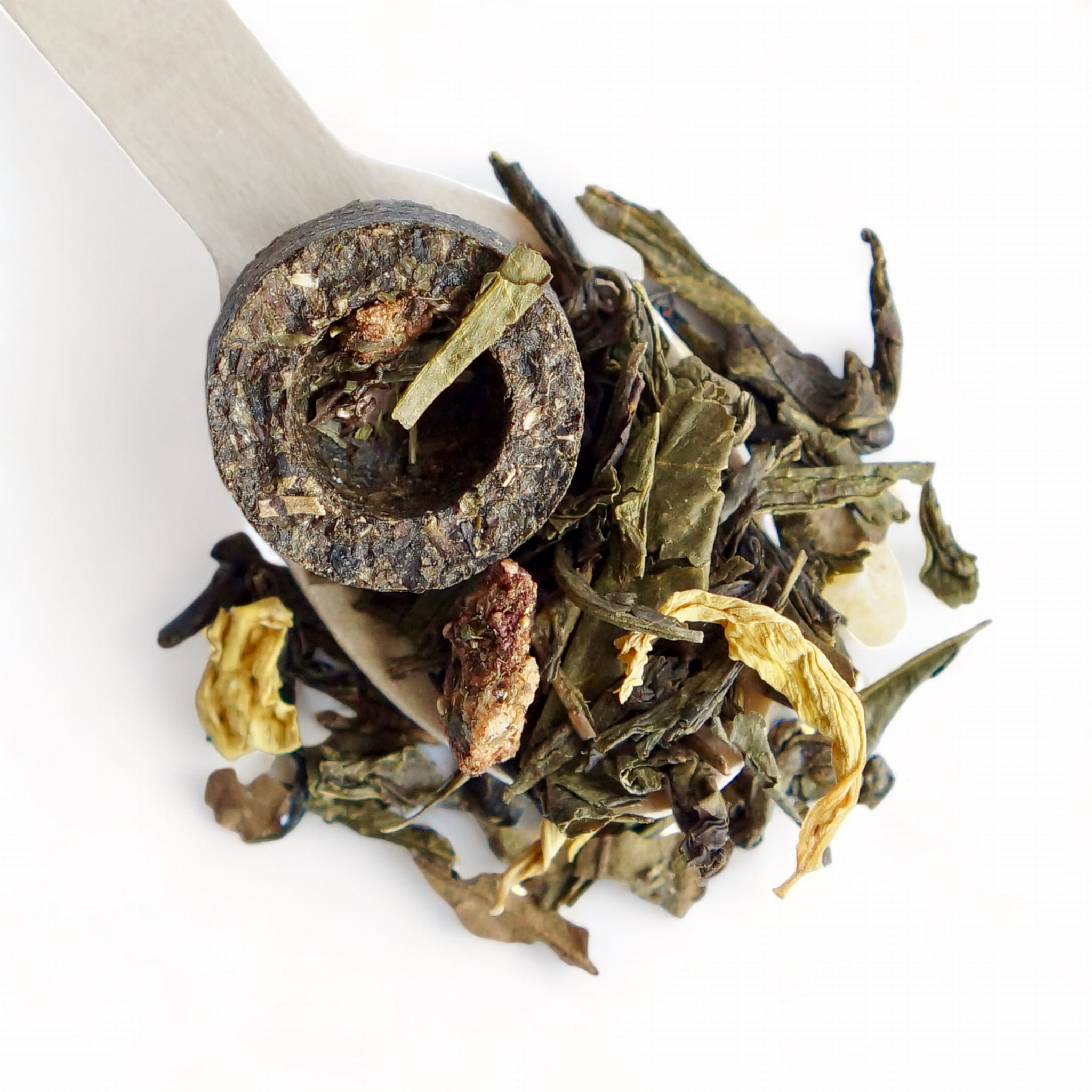 Składniki: herbata zielona chińska sencha, chińska gun powder, mini tuo, chun mee, herbata biała, herbata zielona lung ching, herbata snow bud, herbata pi lo chun, kandyzowane kawałki ananasa (ananas, cukier) (6%), aromat, kawałki truskawek (2%), kwiaty słonecznika