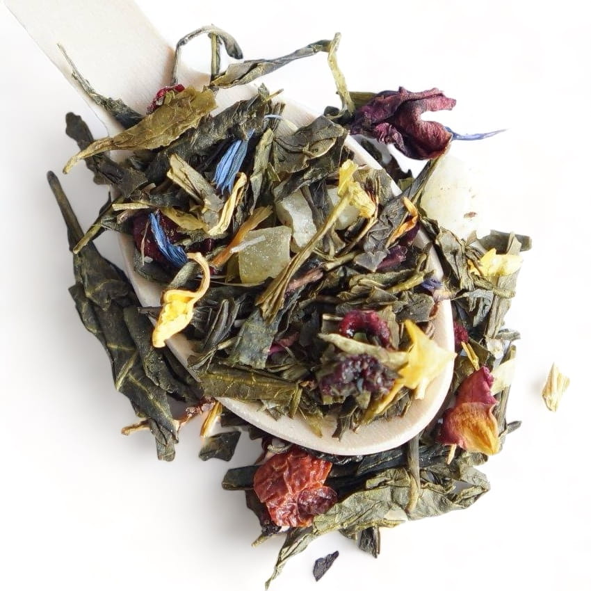 Składniki: herbata zielona sencha, ananas, mango, wiśnie, jabłko, mięta, orzech laskowy, dzika róża, nagietek, kwiat malwy, słonecznika i róży, aromat.
