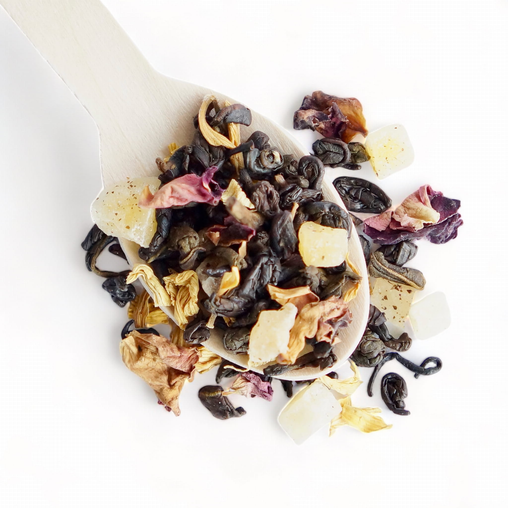 Składniki: zielona herbata (82%), kawałki ananasów (ananasy, cukier, kwasek cytrynowy), kawałki mango (mango, cukier, kwasek cytrynowy), aromat, płatki słonecznika, płatki róży