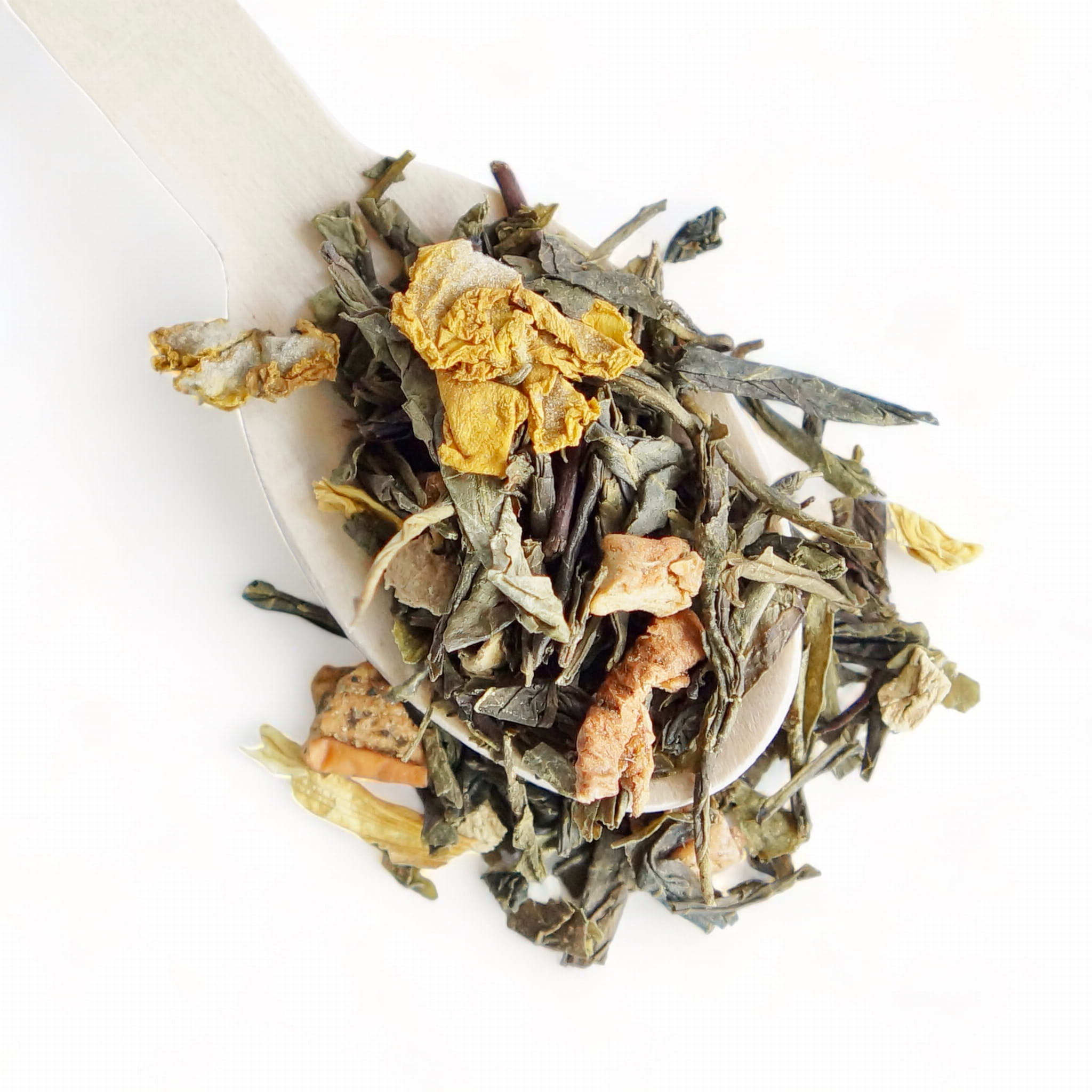 Składniki: herbata zielona (84%), , kawałki jabłek, imbir (5%), aromat z pigwy, kwiaty dziewanny, płatki słonecznika