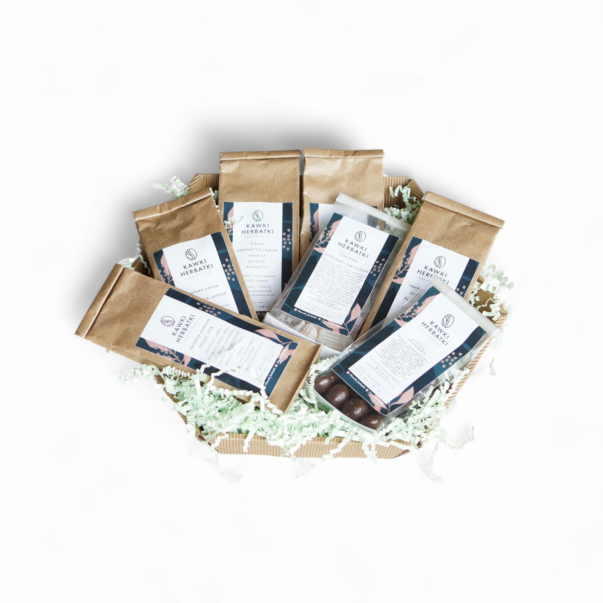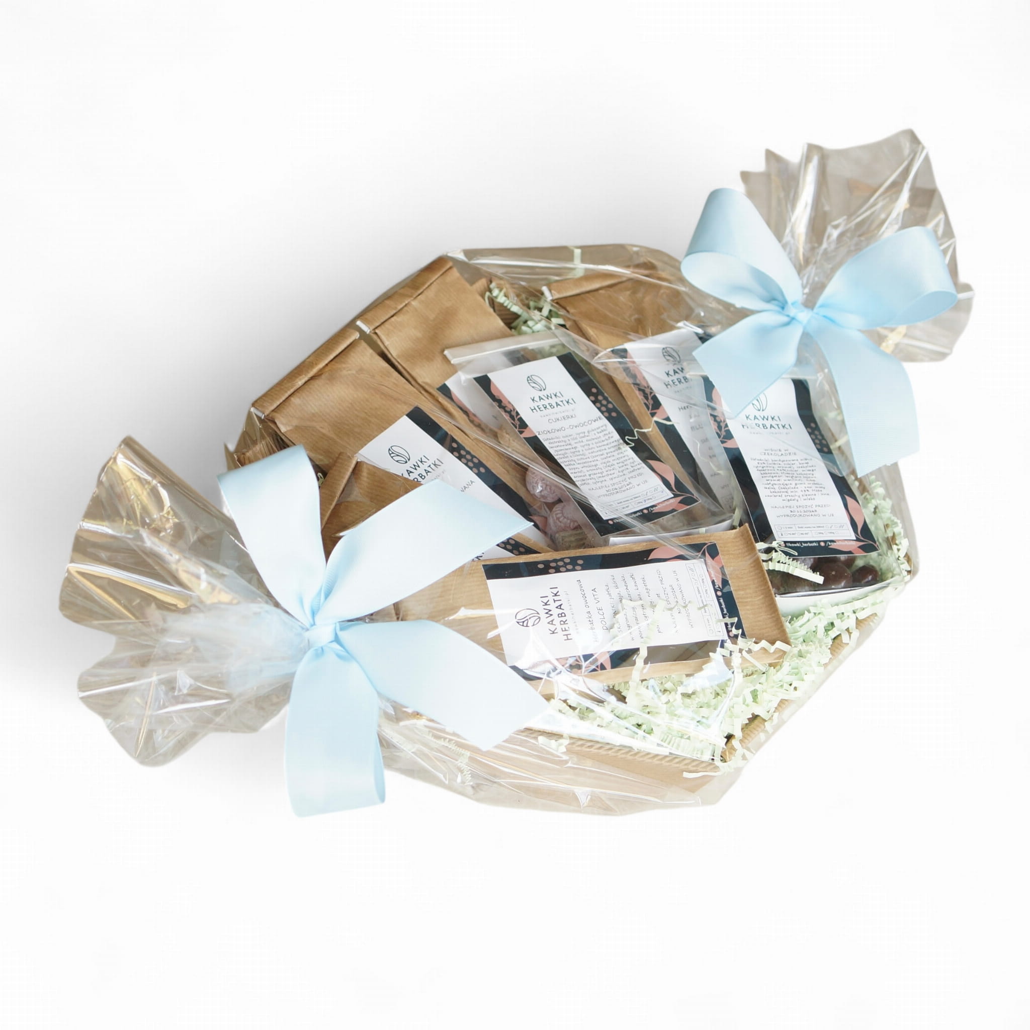 Kosz prezentowy średni: kawy, herbaty, słodycze