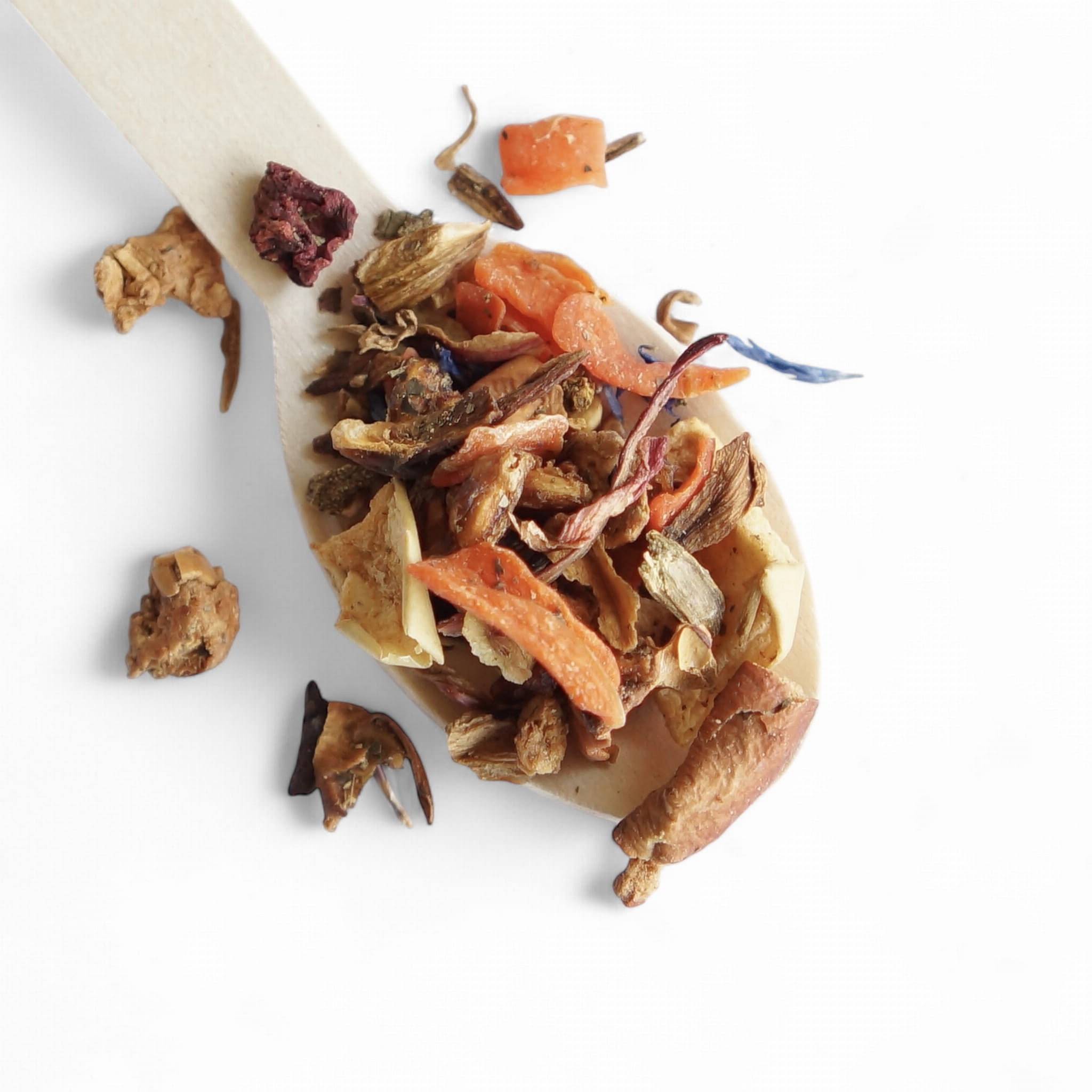 Składniki: jabłka, biały hibiskus, marchewka, granat, duże kawałki jabłek, jagody goji, buraczek, rabarbar, liście jeżyn, bławatek.