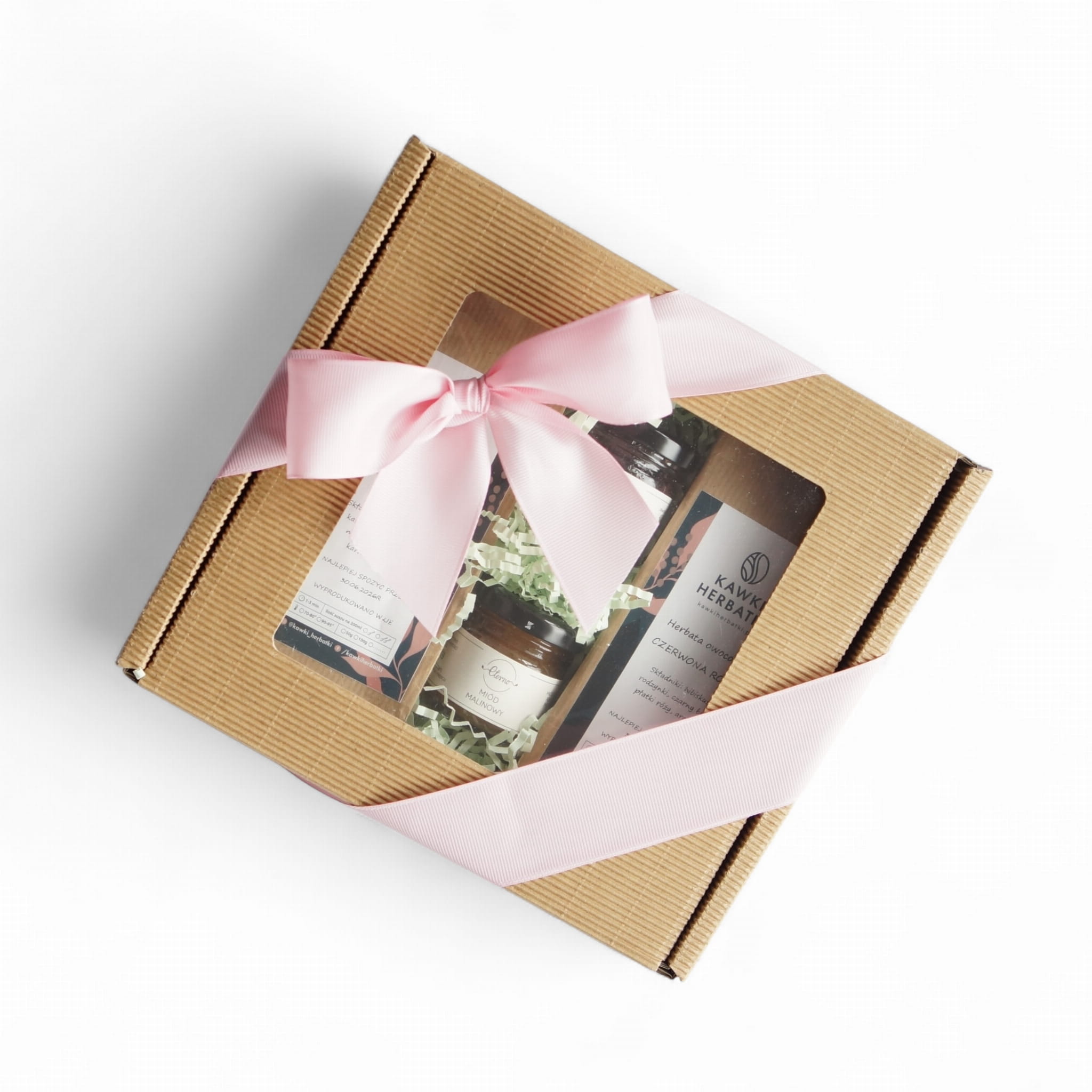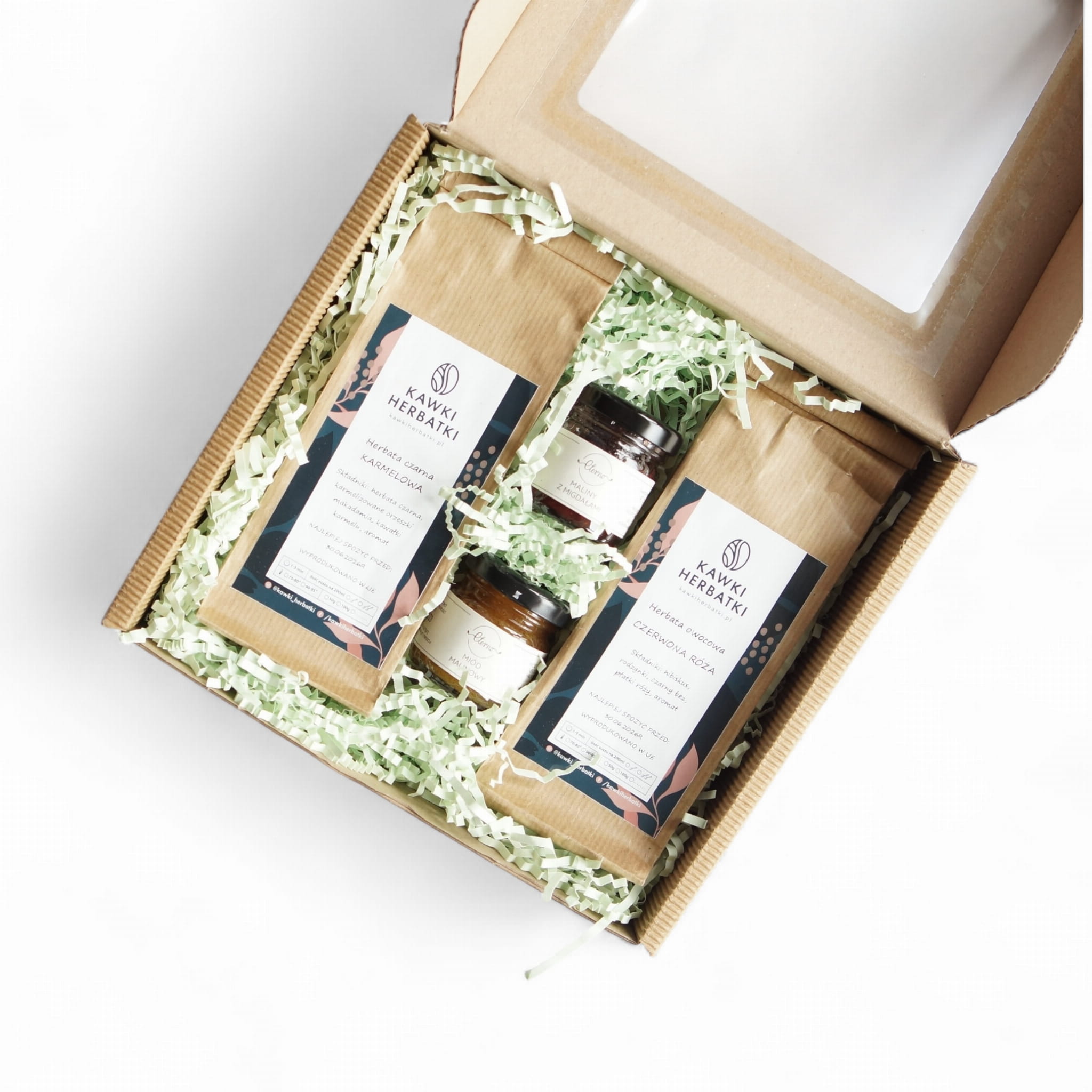pudełko z okienkiem: herbaty, miodek i konfiturka