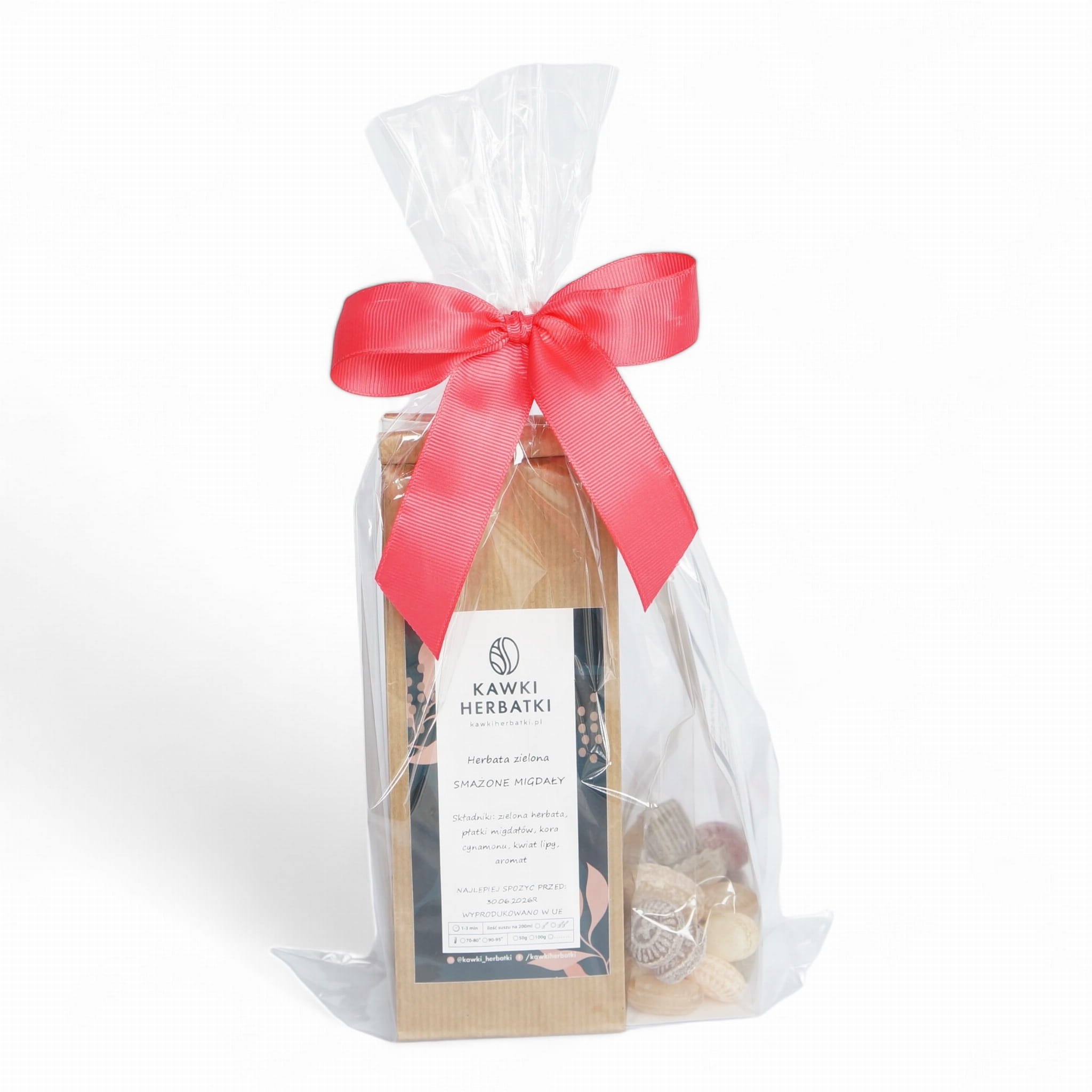 - herbata zielona smażone migdały 50g (składniki: herbata zielona (62%), płatki migdałów (17%), kwiaty lipy, aromat, cynamon)